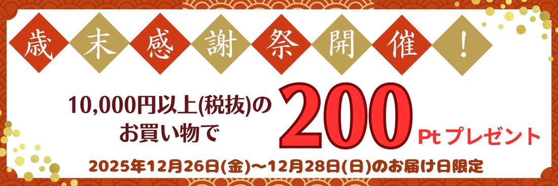 12/26(金)~12/28(日)の届け日を選択いただき、 1回のご利用で10,000円<本体価格>以上のお買物で200ポイントプレゼントいたします!※ポイントプレゼントは1月中旬の予定です。