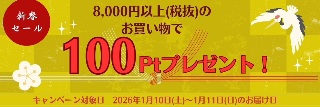あけましておめでとうございます。新春お年玉キャンペーン!1月10日(土)、1月11日(日)、の届け日を選択いただき、 1回のご利用で8,000円<本体価格>以上のお買物で100ポイントプレゼントいたします!※ポイントプレゼントは2月中旬の予定です。