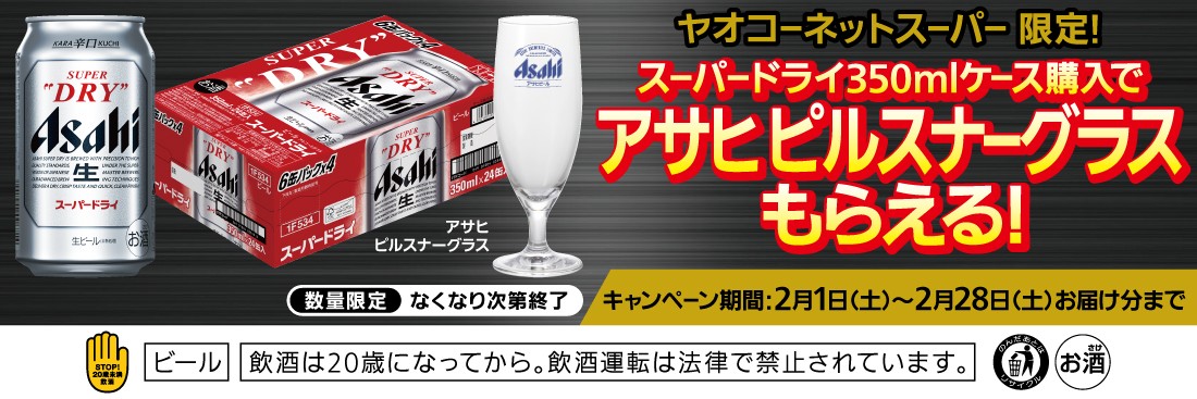 【ネットスーパー限定企画】企画期間中にスーパードライ350mlのケースをご注文のお客様にピルスナーグラスを同梱いたします。※景品は数量限定です。キャンペーンバナー表示中でも配布終了の可能性があります